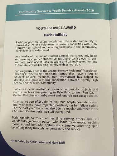 Paris Halliday, Year 11, tonight received a Waipuna/Halswell-Hornby-Riccarton Community Board Youth Service Award. The award recognised her outstanding work both within the Hornby High School community and the wider Hornby community.