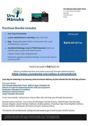 While we understand that Chromebooks are a big expense, it is a very worthwhile investment in your students education. If you are struggling to purchase one outright, please come and talk to Andrea or Lisa at the school office.