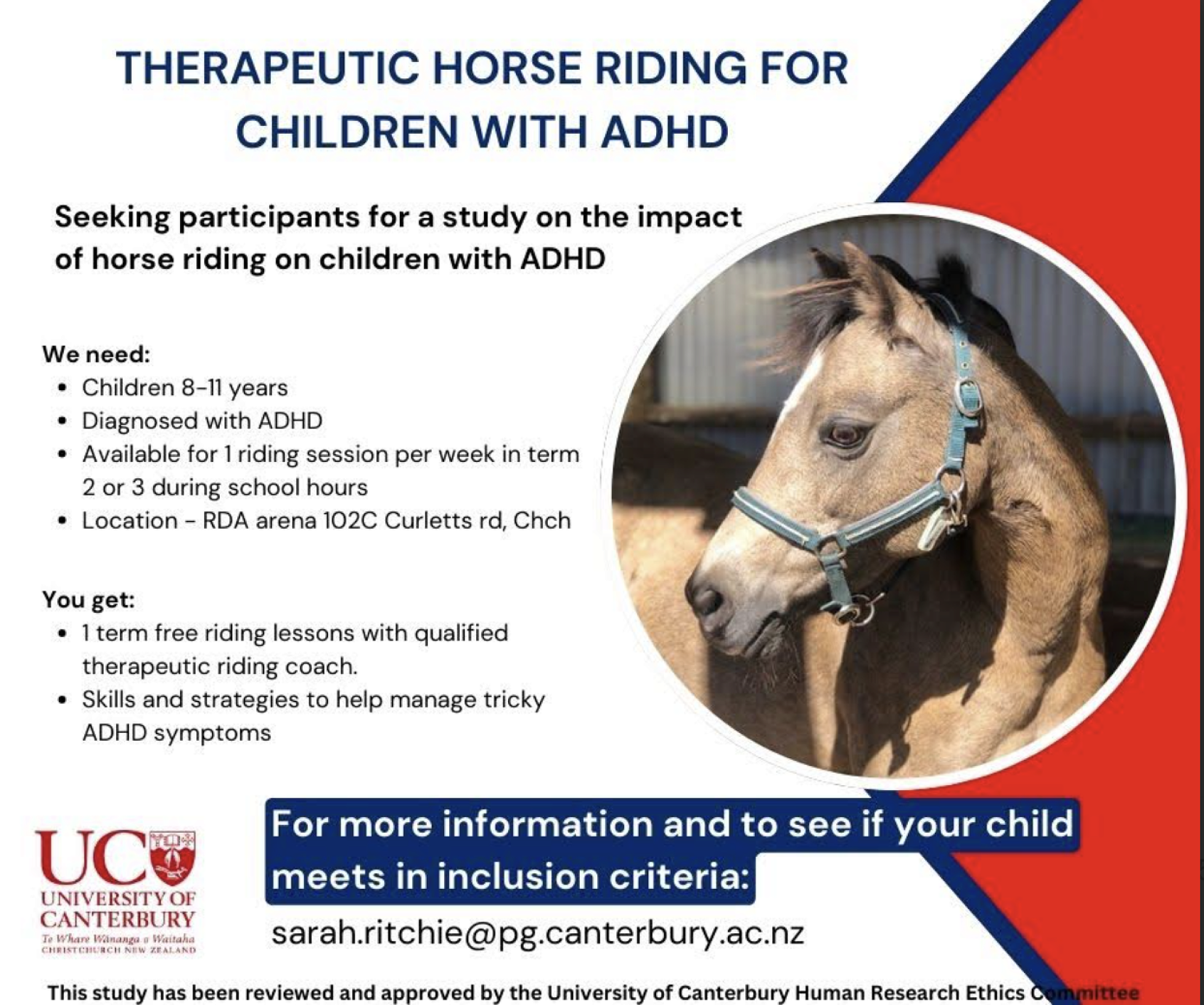 I am a therapeutic riding coach at Christchurch Riding for the Disabled and a masters student at University of Canterbury. I'm currently completing my masters in Child and Family Psychology. My research is on therapeutic riding for children with ADHD. I am looking for families to participate in my study.