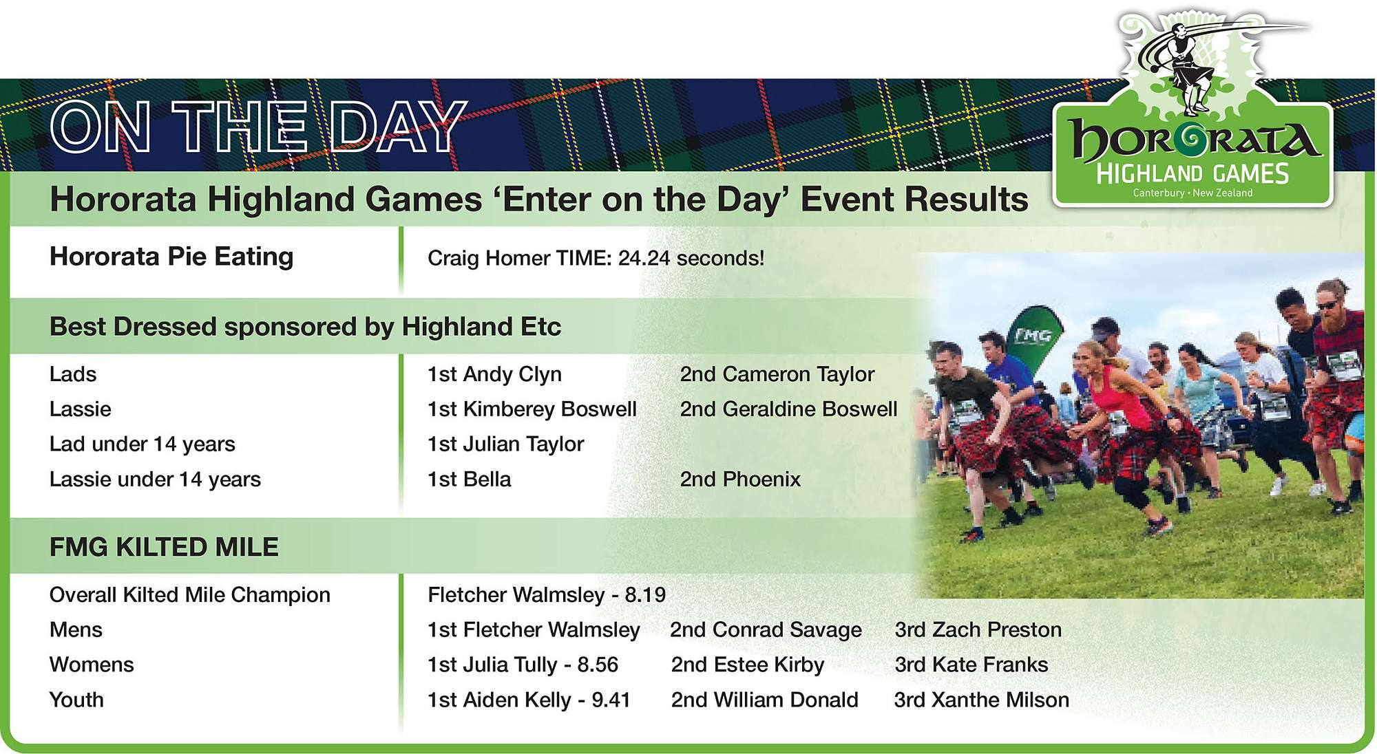 At the Hororata Highland Games there are many opportunities to join in as a competitor including the Kilted Mile, Best Dressed and Hororata Pie eating.
