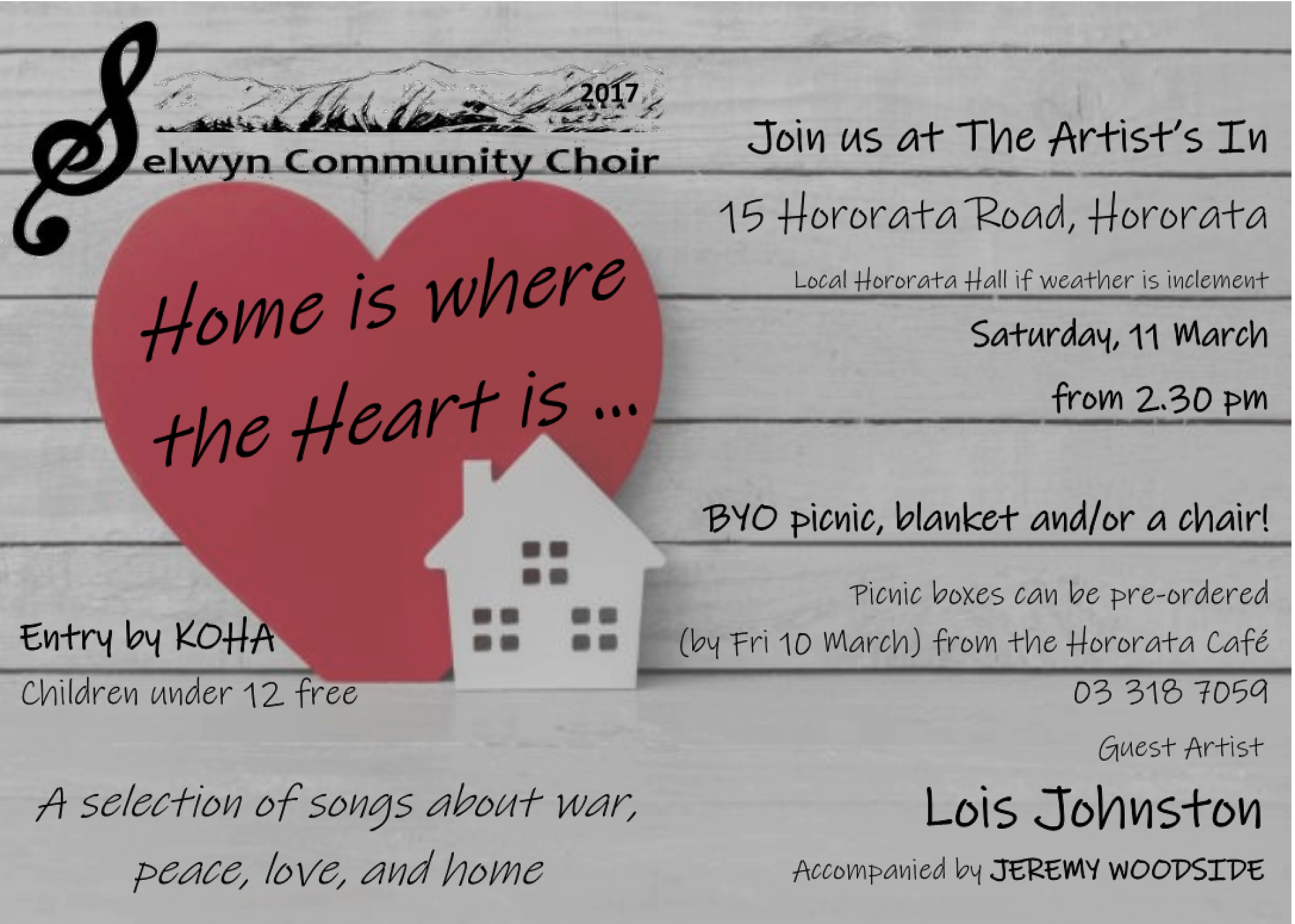 The Selwyn Community Choir, whose members are from all over the Selwyn District, is proud to present "Home is Where the Heart is", a selection of songs about love, peace, ANZAC, and home.
