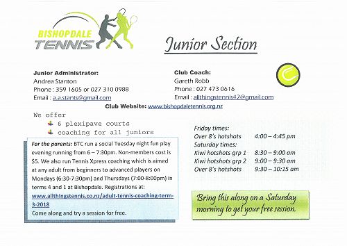 This week the Years 3-6 students have enjoyed learning some tennis skills.  For children who are interested in building on these skills, Bishopdale Tennis Club is offering coaching.  Details are on the flyer below.