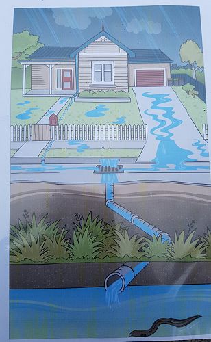 Eels, and the invertebrates and fish they eat, are affected by pollutants in the water. When we wash our cars on the street, the soap washes into the storm water drains. As well, copper brake-pads on cars leave traces of copper that get into the streams. Your child might ask you if you could get ceramic brake pads next time you go to the mechanic. (Apparently they don't cost much more than the copper ones). Zinc treatments on roofs leach zinc into the streams, so the scientists suggest painting them. Oil leaks should be fixed, as oil is another pollutant. As we all know, rubbish left lying on footpaths and roads, collects in the gutters and washes straight down the stormwater drains and into the streams.