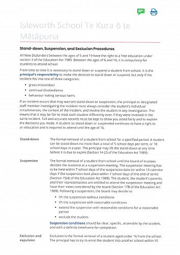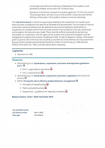 In meeting with parents I am often asked about the guidelines around stand-down and suspension. I have included the procedures for this so that people are fully informed of the process and who has responsibility for it within the Education Act 1989.