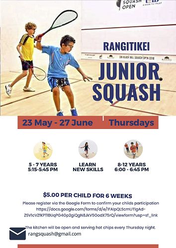 From the 23rd May - 27 June, Rangitīkei Squash are offering sessions for tamariki 5-7 years (5:15 - 5:45pm) and 8-12 years (6-6:45pm). There is a small cost of $5 for the 6 weeks. See the advert below.