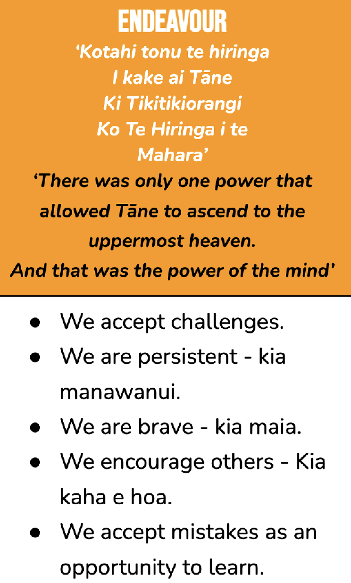 This year our mahi tahi focus is another feature of our school vision 'Achieving excellence through aroha, endeavour and resolution'. This year we have chosen 'endeavour' as our mahi tahi.