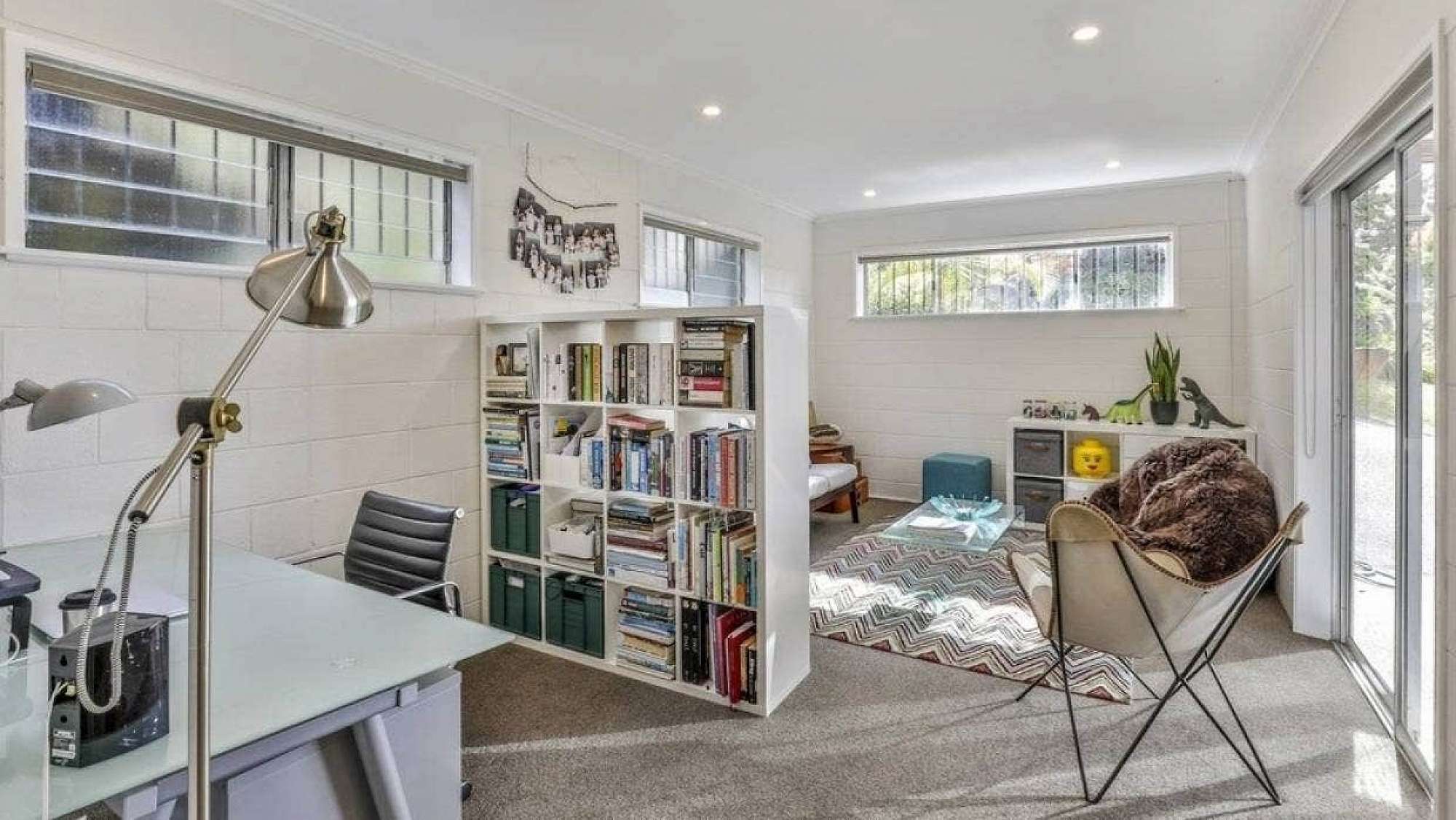 One can be closed off, while two steps lead up to a second living space with a polished concrete floor and large windows, creating a light and bright space.