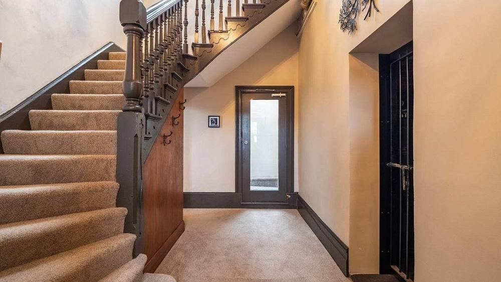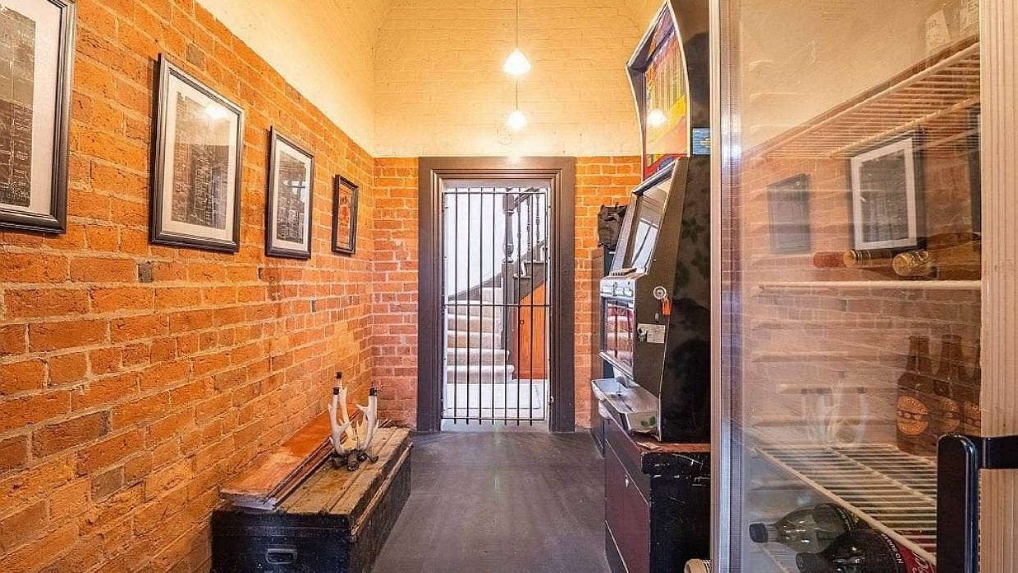 A classic stairwell leads down to what would have originally been the safe. Instead of gold and wads of cash, you might like to fill it with other sorts of valuables – like wine, the fridge in the listing photo suggests.