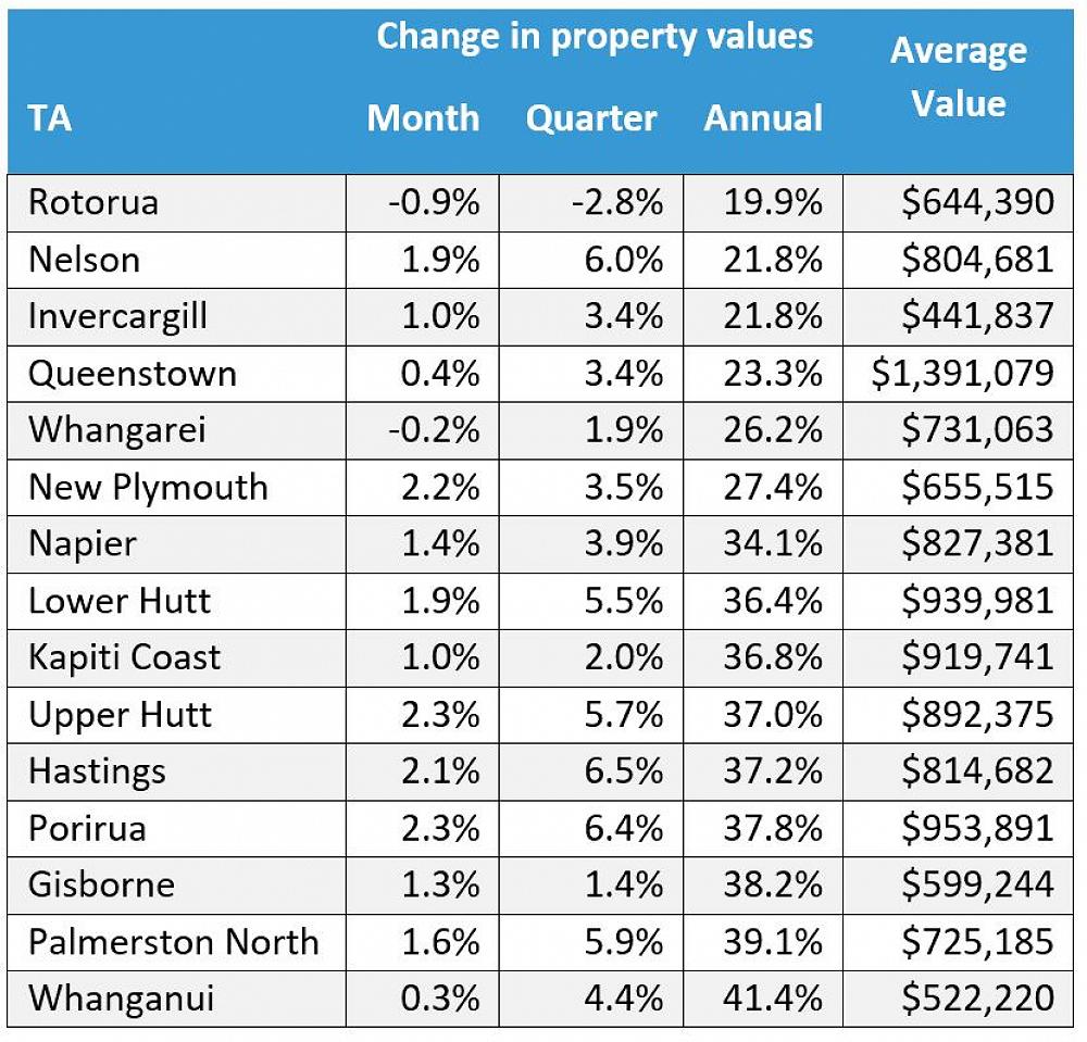 “Rotorua in particular has seen a noticeable shift in momentum, with the quarterly rate of change dropping into the negatives (-2.8%) for the first time in over two years. This is especially of interest following a quarterly growth rate as high as 9.7% only a few months ago, at the end of May 2021,” said Mr Goodall.