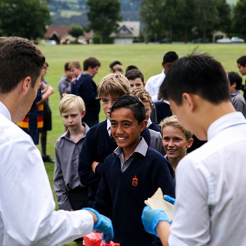 Visit this articleOn February 12th both the Year 13 boys and the young Year 7 students followed the annual tradition of meeting each other, while eating sausages and patties and playing sporting activities on the field.