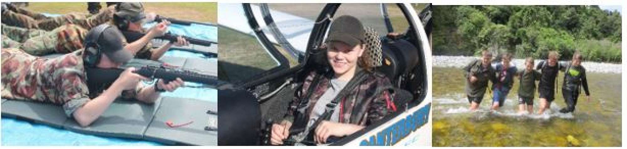 The Air Training Corps is part of the New Zealand Cadet Forces. Uniform is provided free. We offer a four-year training programme which, at Squadron level, including Aviation Studies; Gliding; Foot and Rifle Drill; Firearms Safety and Range Procedure; Small-bore rifle shooting; Bush-craft training (including map and compass, bush survival skills, camping and tramping, river-crossing skills, etc.); Adventure training; General Service Knowledge; First Aid; Leadership; Navigation; Radio Communications; Instructional Technique; trips away to airshows, military bases, etc.