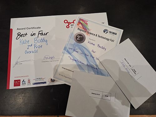 Congratulations to Katie Boddy for coming second overall in the Canterbury West Coast Science Fair in Christchurch this weekend!