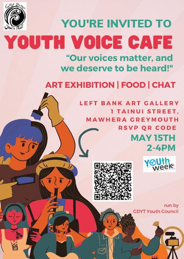 *Youth Council is the first Monday of each month, 6-8pm at the Left Bank Art Gallery, 1 Tainui Street. Youth Council aims to have a voice in what happens for youth in the Grey District, and to take part in the community through projects and events.