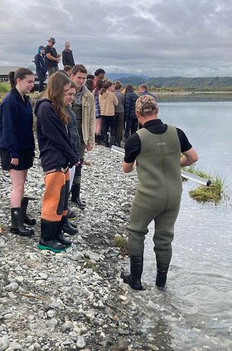 The council water and hydrology team allowed us to use special equipment to test the water of the Hokitika river. The equipment told us the turbidity, temperature, the amount of oxygen it had, and so on. There were also opportunities for students to put waders on and test the water quality independently and in groups. We were told about the various jobs in this field of science as it is more practical and hands-on.