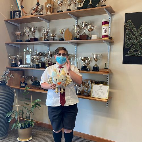 Year 13 student Maddy Sweetman with her beautifully made albert the owl pillow