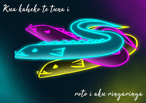 "The mural is of three brightly coloured tuna (eels) along with the whakatauki “Kua kaheko te tuna i roto i aku ringaringa”. This directly translates to “I let the eel slip through my hands”, so this mural represents the idea of don’t let bright opportunity slip through your hands. Tuna is also a very important food resource to Ngāi Tūāhuriri living in Kaiapoi pā."