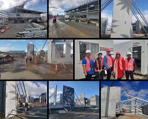 It is certainly amazing how much has actually been achieved in recent weeks from roof trusses on the whare to the roof being installed on the Blomfield building. The large teaching block has most of the panels in place and the panels for the smaller teaching block will be put in place in the coming days. The concrete panels look amazing with their decorative artwork.