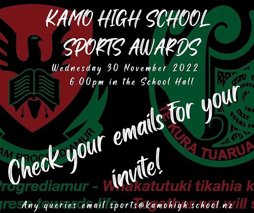 If you participated in a School Sport/Team for 2022 you should have now received your invite to our Sports Awards to be held on Wednesday, 30th November in the School Hall at 6.00pm. Can you please RSVP as soon as possible if you plan on coming along. In the event that you have not received your invite by email and feel you should have received one, please do not hesitate to contact us on sports@kamohigh.school.nz.