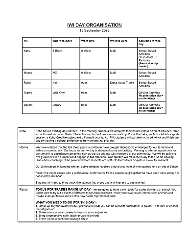 Please find here some logistical information that parents may need as we head towards the Iwi Day which is on the 15th September 2023.