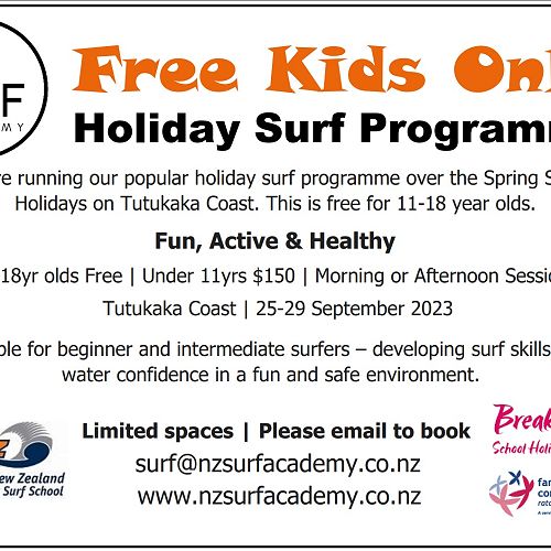 Visit this articleGreat news! We have funding to offer our Holiday Surf Programme on the Tutukaka Coast over the spring school holidays. Our aim is to get kids active and give them the confidence to have fun at the beach through the enjoyment of learning to surf.