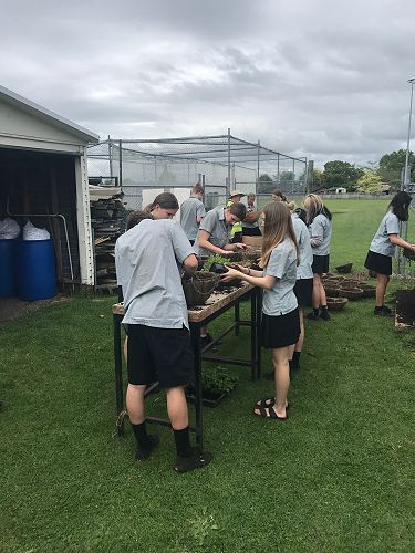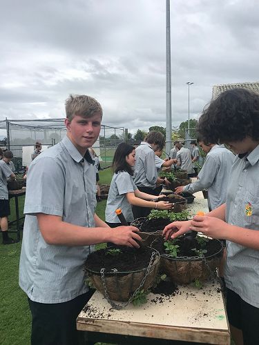 With about 140 needing planting up with seedlings, Katikati College Innovative Horticulture students rolled up their sleeves gain to undertake the task for the Lions, who co-ordinate the project, provide the materials, and will soon hang the baskets.