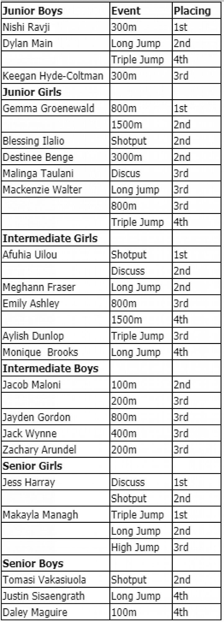 Owing to rain some events were cancelled and all of the track events were timed finals (no heats). Though the conditions were slippery and steamy, some good results were achieved, with 22 athletes achieving qualification to Wai-BOP Athletics Champs, some being dispensated through due to their event not going ahead. The best results are shown below. We apologise for the quality of the scan - it's what can happen when we have to work at home...
