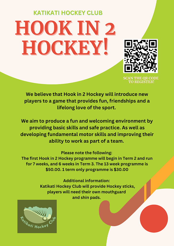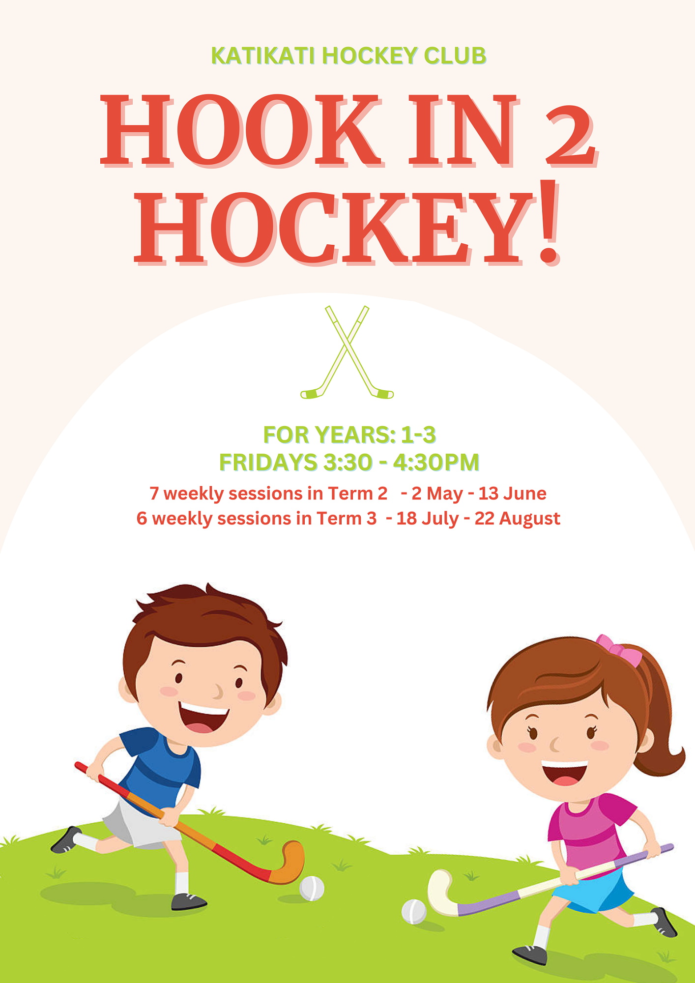 Thank you to Ruth from the Tauranga Hockey Club who came out to Katikati to run class sessions for our Year 1 and Year 2 children. This was a great opportunity to give our tamariki the experience to try this awesome sport and having a go on the Hockey Turf at Katikati College made it even more exciting. See the posters below if your Year 1-3 child is interested in playing hockey in Term 2 or Term 3.