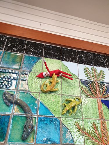 On Tuesday 1st December we had a huge amount of very excited children checking out these naughty elves in the foyer. One was floating around holding on to balloons - the wind was blowing him through the foyer and the other one was hanging on to our tiled mosaic in the hallway. They also stuck lots of bows on Room 24's portraits of Mrs Augustine - they are so cheeky. Do you think there will be more mischief to come?