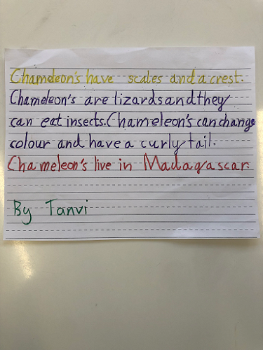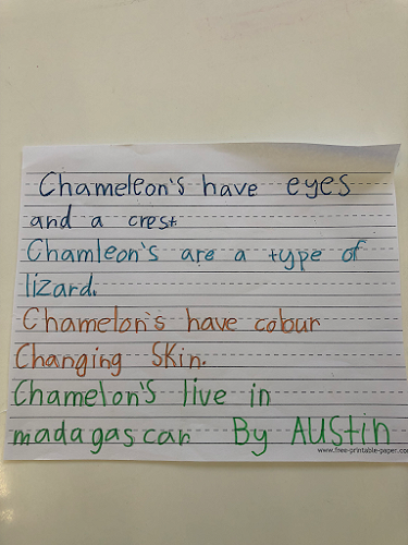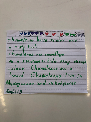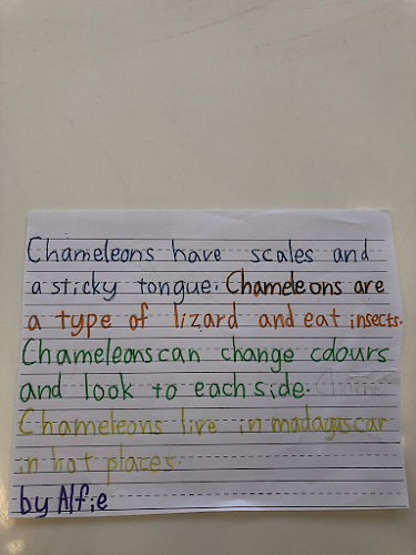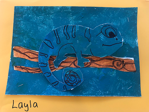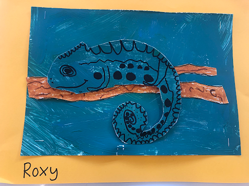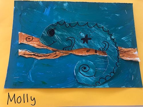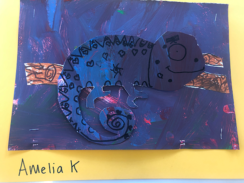 We really enjoyed researching chameleons and creating our own camouflaged chameleons. We hope you can spot them as they have changed colour to match their surroundings!