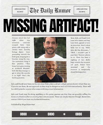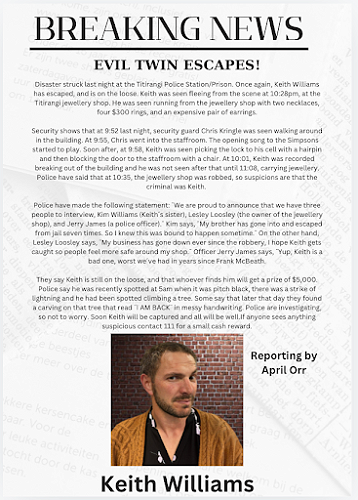 Rūma Rua B has been producing lots of fantastic writing this term, including poetry and some investigative reporting. Our journalists have been covering a spate of criminal activity, allegedly committed by the evil twins of staff members.