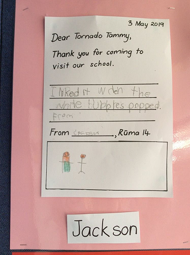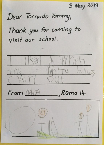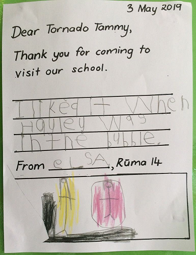 Rūma Tekau ma whā enjoyed watching Tornado Tammy's science show as part of our inquiry this term. We wrote her thank you letters, drawing and describing what we loved most about her show. We then popped them all in an envelope and posted them by ye olde snail mail in the post box outside the dairy next door to the school.