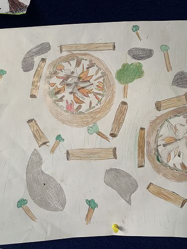 It wasn't easy at first. We worked together to find food and wood for the shelter. We found berries, coconuts and sticks from trees for a fire. We used the fire to cook lots of food.