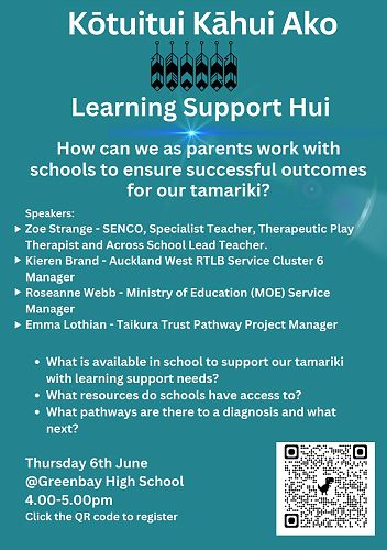I have also attached an invitation to any and all parents who would like to attend a special hui being offered within our group of schools - Kōtuitui, which offers an insight into services and resources available to help us support our children with learning needs. Please see the poster attached for the details.
