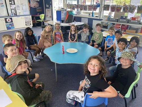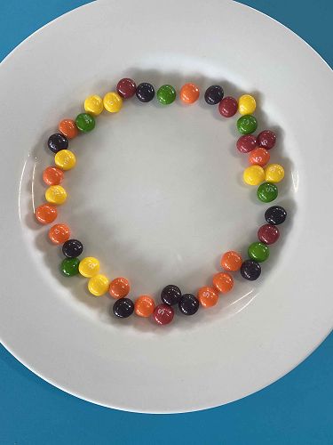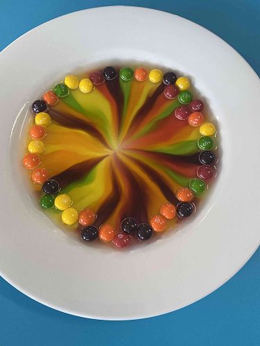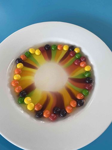 Yesterday we did an experiment. We put skittles on a plate. Then we poured the water inside the middle of the skittles. Then slowly the skittles rose and it was a beautiful rainbow. I loved the experiment because of the rainbow. When we shook the plate it turned brown like soy sauce. It made me feel happy. We got to eat them in the classroom. It was yum. I loved it.