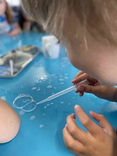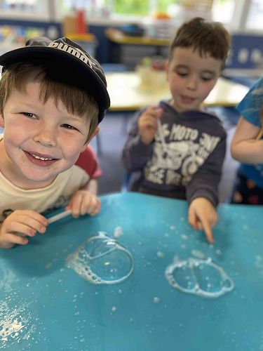 We made bubbles on the blue table and it got big. I made three bubbles inside each bubble. My bubble was enormous.