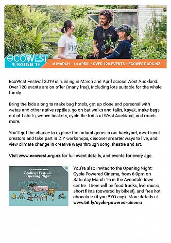 EcoWest Festival 2019 is running in March and April across West Auckland. Over 120 events are on offer (many free), including lots suitable for the whole family.