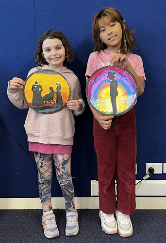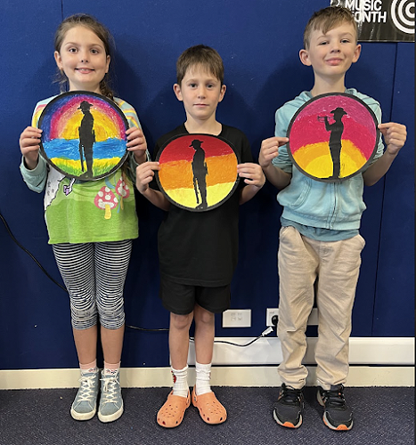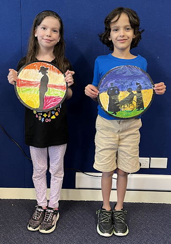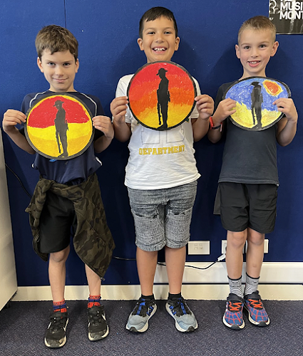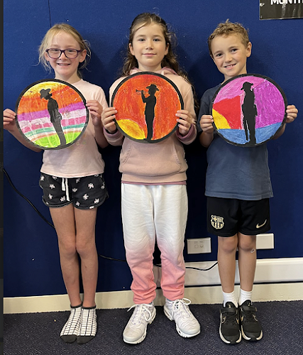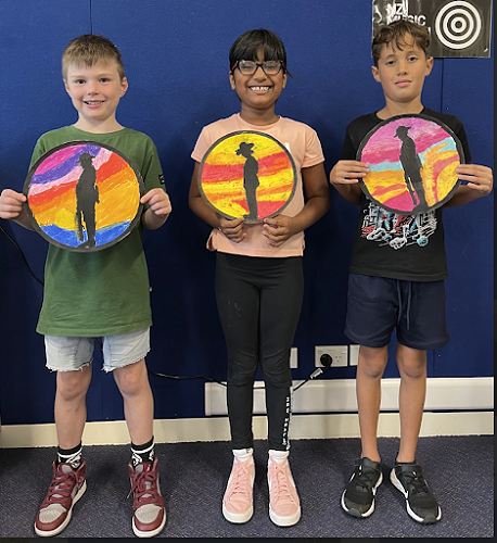 To commemorate the veterans, we produced silhouette art of soldiers and nurses standing at sunrise. We used oil pastels and carefully blended the colours to create an aesthetically pleasing sunrise.