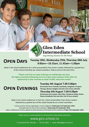 Glen Eden Intermediate School GEIS — June 11th, 2020 See below for Glen Eden Intermediate Open Days and Evenings. Gallery