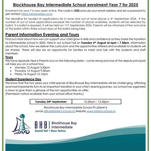 Blockhouse Bay Intermediate - Year 7 enrolments for 2025 now open