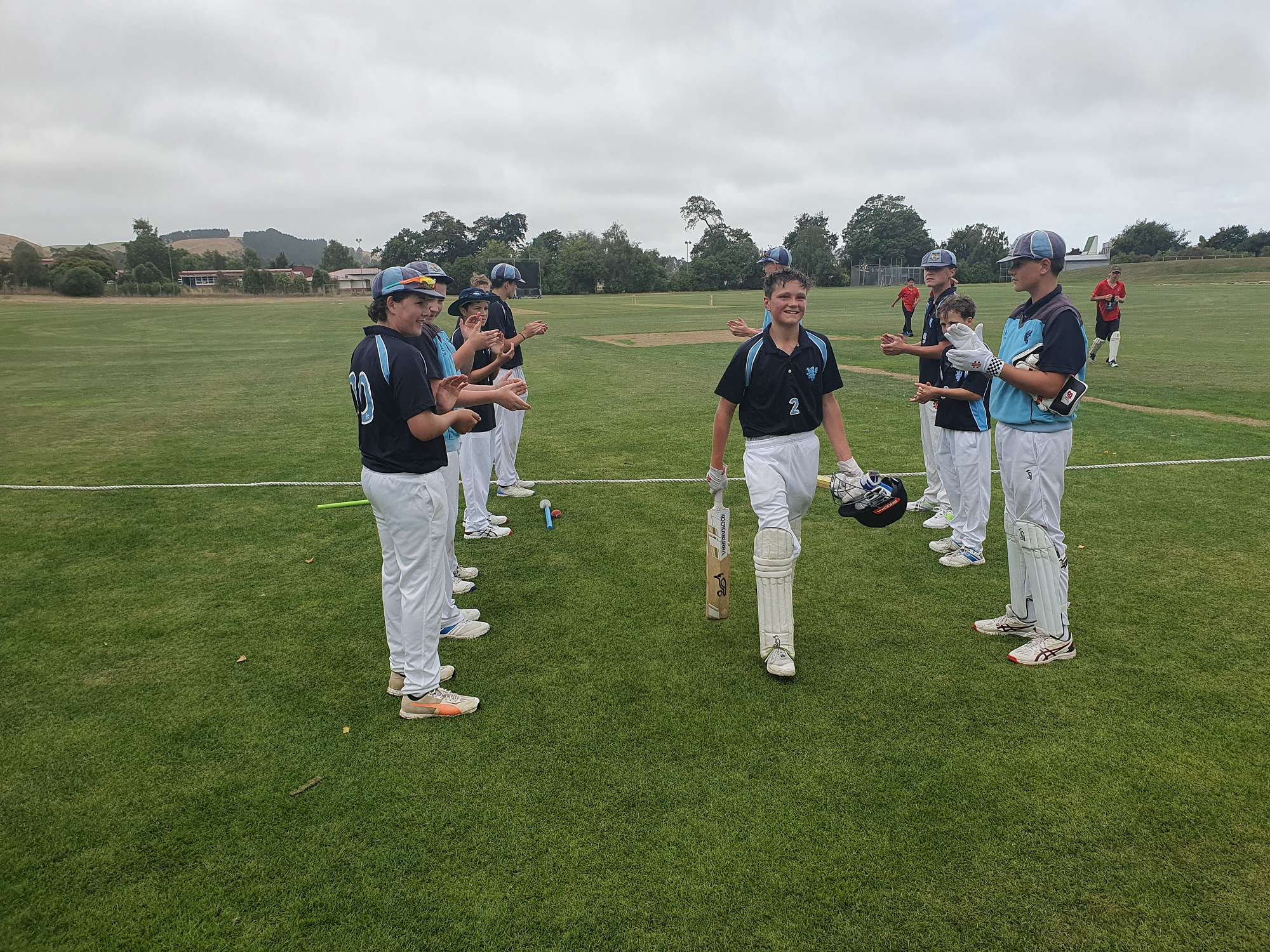 Levi finished 110* off 91 balls—his first century. He was enthusiastically cheered off the field by his teammates and Mr McIvor, who was lucky enough to be present for this fantastic achievement.