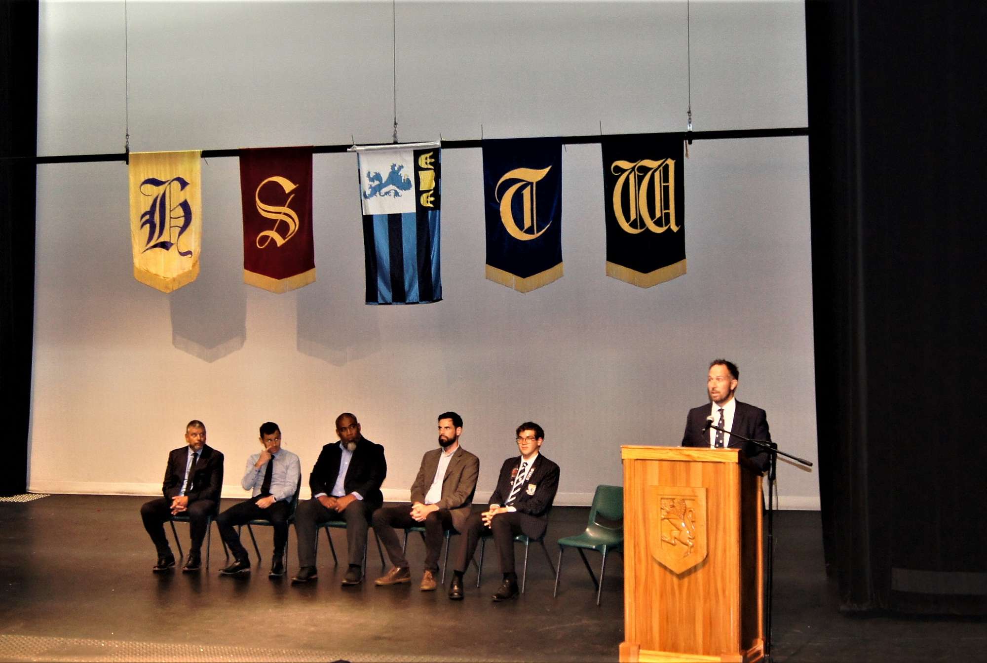 On stage with him seated from left is: Mr Holger Korth, Guidance Counsellor; Mr Cameron McPhail, Academic Dean, Mr Jope Tudreu, Pasifika Dean; Mr Isaac Hensman, Māori Dean; and King's Head Boy Massimo Pezzuto.