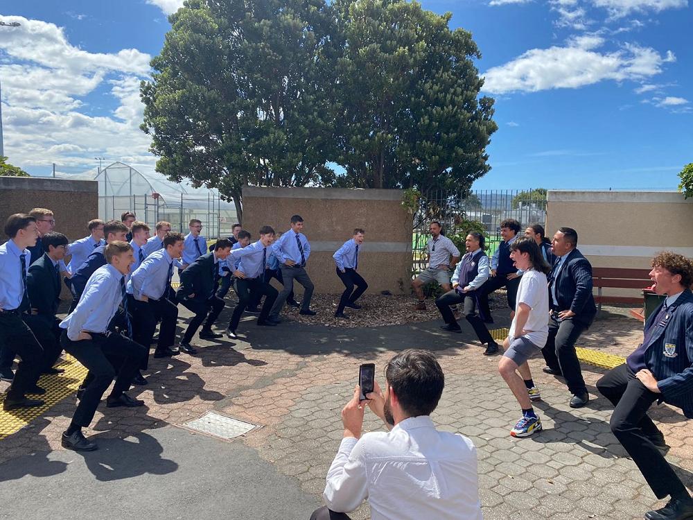 Isaac Hensman, Matu Pene and several students guided our visitors in the learning of the Haka. An experience the Leibniz students embraced well.