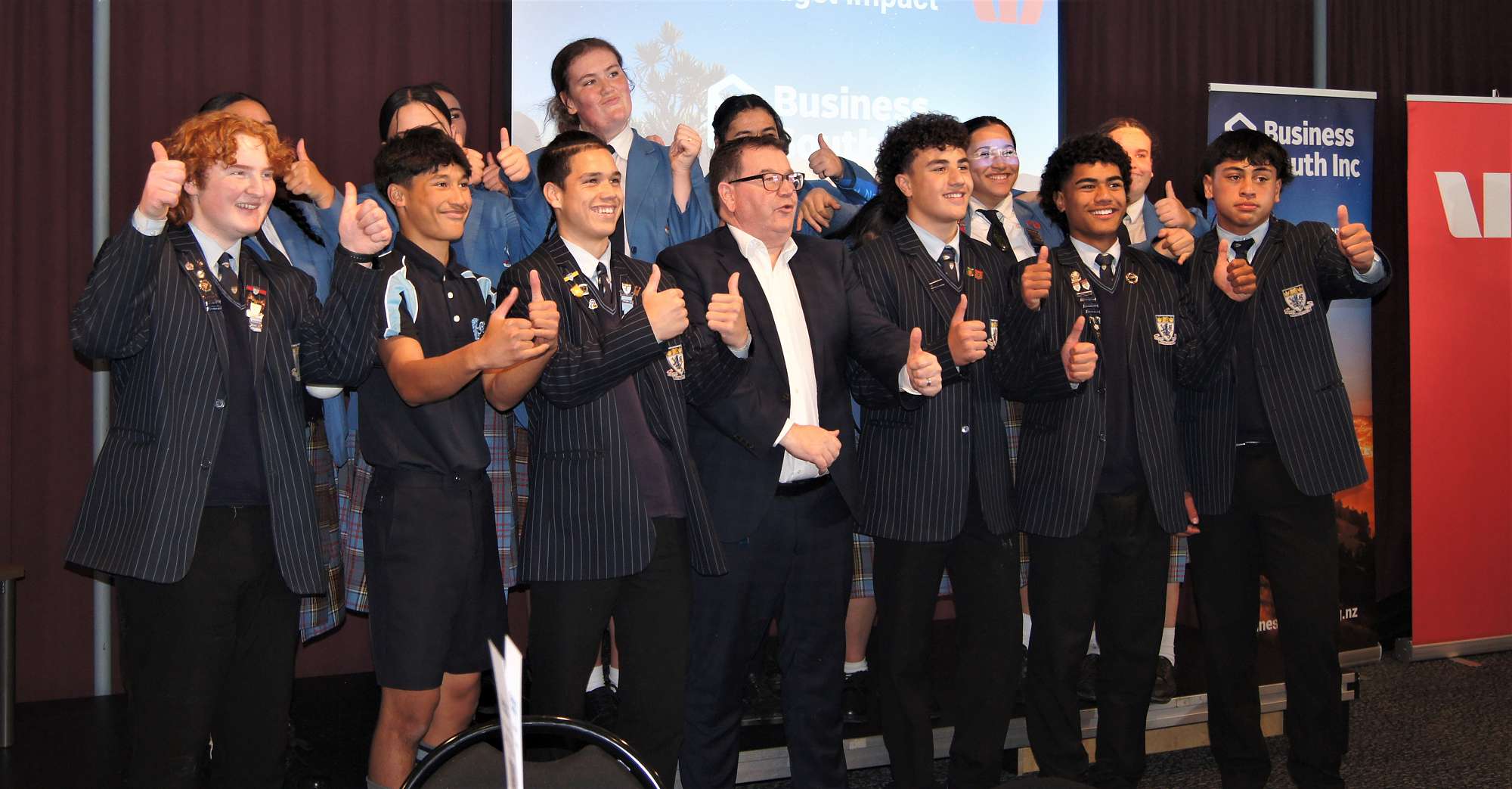 King's former Head Boy the Minister of Finance Grant Robertson pictured here with He Waka Kotuia members on Thursday at the Edgar Centre