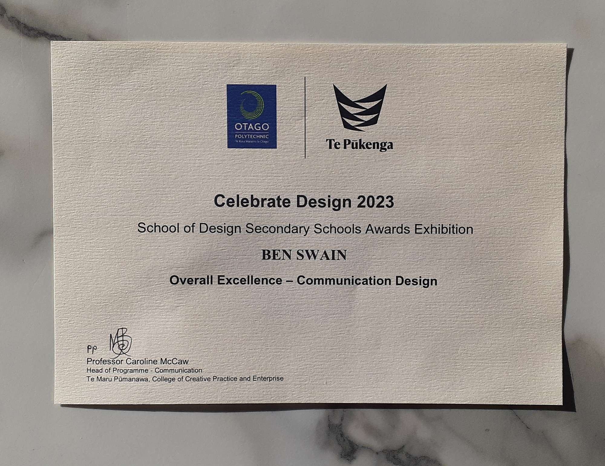 Ben Swain won the overall Excellence Award in Communication Design from the Otago School of Design (Te Pukenga) last Thursday.