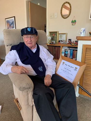 Joe was delighted with the gifts from the school. The goody bag including the cap, scarf, some lapel badges, the certificate, and the magnificent fob watch engraved by John Bezett. He was impressed with Hugh Kidd's citation and the effort he went to.
