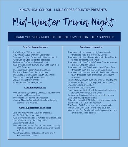 Less that a week to go until the King’s Lions’ Cross Country Quiz Night at Pirates Rugby Club where we are aiming to raise funds for our 2024 Season and three charities: Gumboot Friday, Achilles New Zealand and NZ Prostate Cancer’s Blue September Campaign.