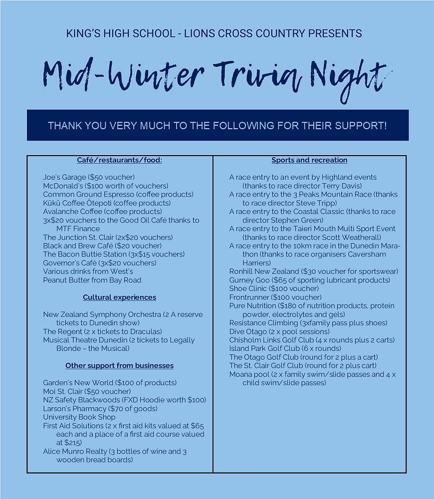 Support King's Lions' Cross Country Mid-Winter Quiz Night