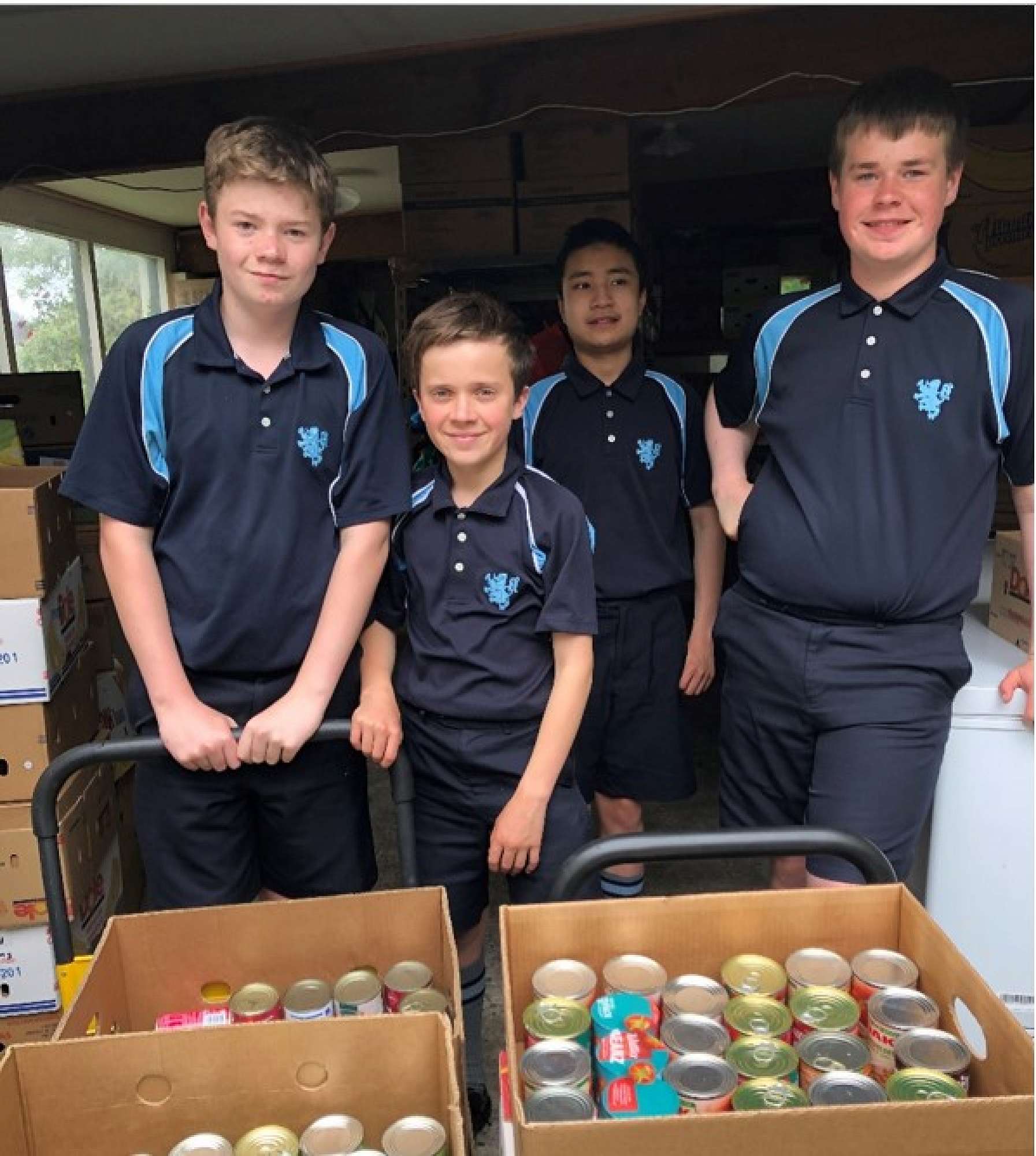 The second group of Louis McNabb, Ian Tan, Nick Reid and Finn Boucher continued the good work in the afternoon and moved all these boxes down into the basement area before unpacking the cans from their boxes and stacking them on the shelving units for easy access and dispersal.