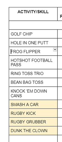 A range of activities including Golf Chip and Hole in One, Ring Toss Trio, Smash a Car, Rugby Skills and even a Dunk the Teacher.