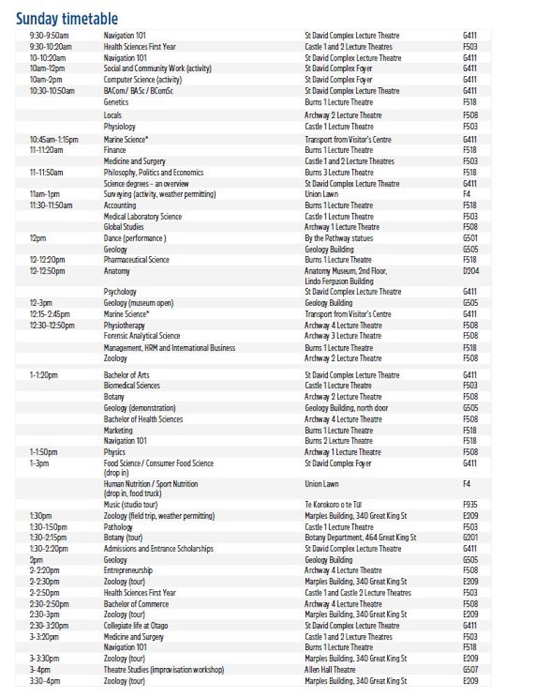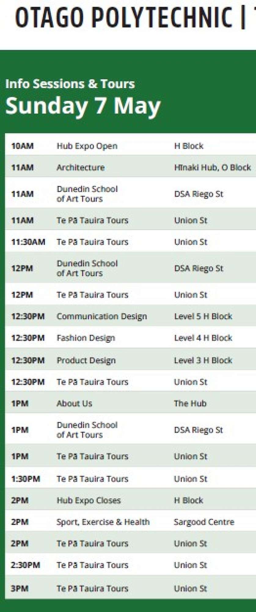 To plan your day check out the Tertiary Open Days full booklet and Tertiary Open Days planner (PDF attached below) or click this link otago.ac.nz/opendays to find an electronic copy of the Open Days booklet, as well as a shorter Open Days planner (printable).